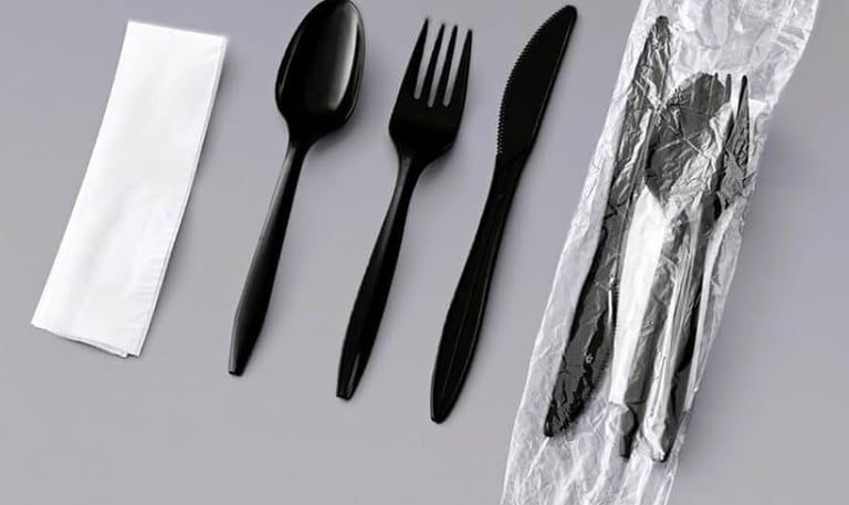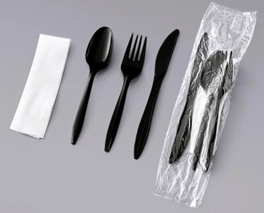 Durable plastic forks, knives, and spoons designed for single use, ensuring convenience and hygiene in busy restaurant settings.